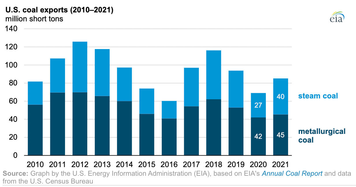 據美國能源信息署的數據,2021 年美國煤炭出口量從 2020 年的 6900萬短噸增長23%至 8500萬短噸。動力煤出口增長 47%至4000萬短噸,冶金煤出口增長8%至4500萬短噸。2021年,美國煤炭出口占國內煤炭產量比重升至15%。