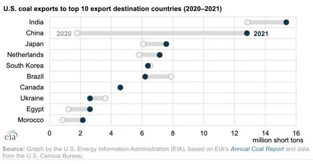 2021年,美國煤炭的前五個出口目的地是印度、中國、日本、荷蘭和韓國。印度連續第五年進口最多的美國煤炭,為1530萬短噸(其中77%,1180萬短噸是動力煤)。2021 年,中國進口的美國煤炭數量位居第二,為1300萬短噸(其中91%, 1170萬短噸是冶金煤)。美國運往日本的煤炭分為動力煤(56%)和冶金煤(44%),運往韓國的煤炭有 85% 是用于發電的動力煤。盡管荷蘭是美國煤炭的最大進口國之一,但荷蘭主要是在整個歐洲運輸煤炭的轉運樞紐,只有10%的煤炭留在荷蘭供國內使用。