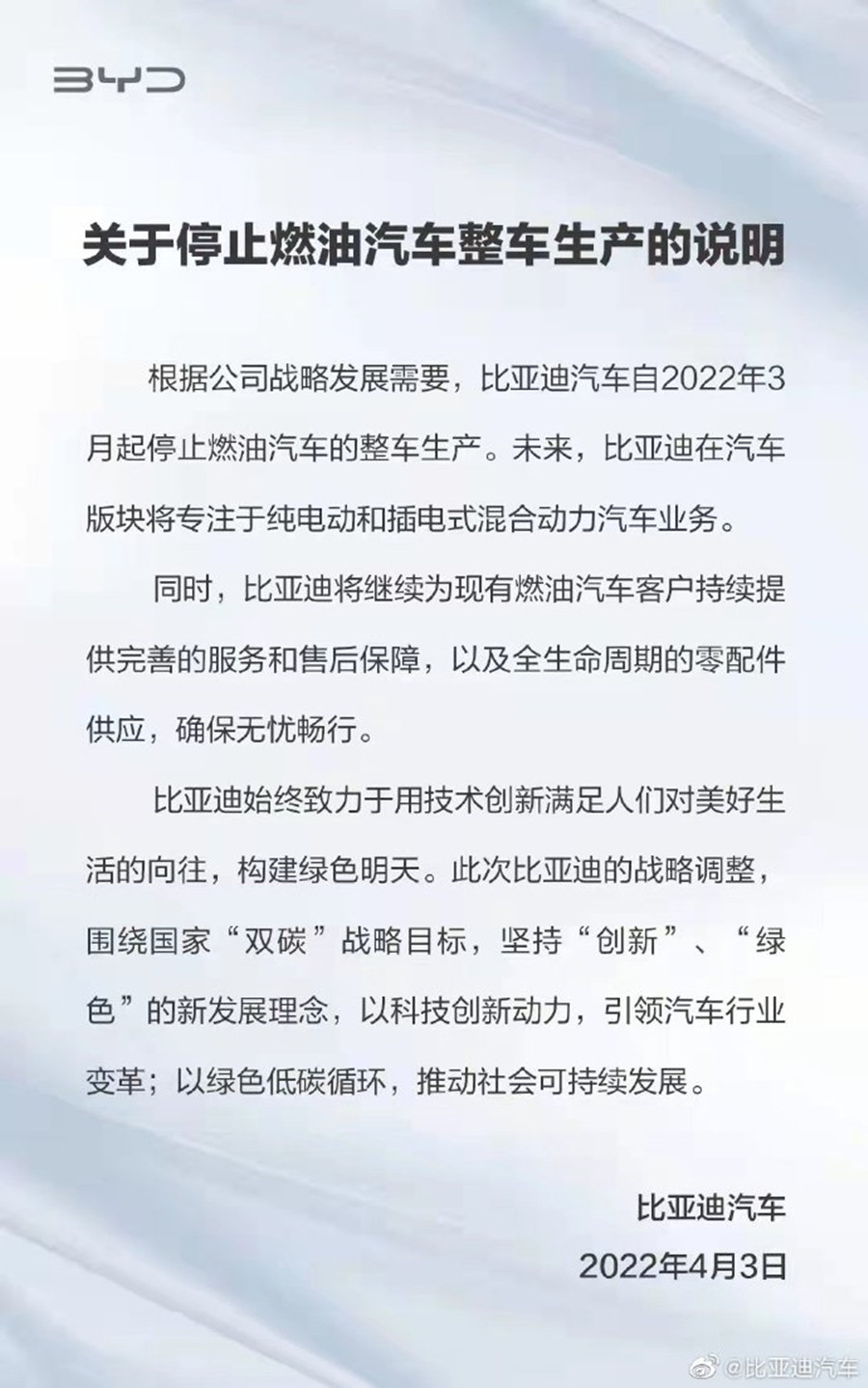 4月3日,比亞迪汽車在其官方微博發布《關于停止燃油汽車整車生產的說明》的公告,表示根據公司戰略發展需要,比亞迪汽車自2022年3月起停止燃油汽車的整車生產。在公告中,比亞迪方面表示,“未來,比亞迪將專注于純電動和插電式混合動力汽車業務。”同時,公司將繼續進行燃油汽車零部件的生產和供應,為現有燃油汽車客戶持續提供完善的服務和售后保障,以及全生命周期的零配件供應,確保無憂暢行。