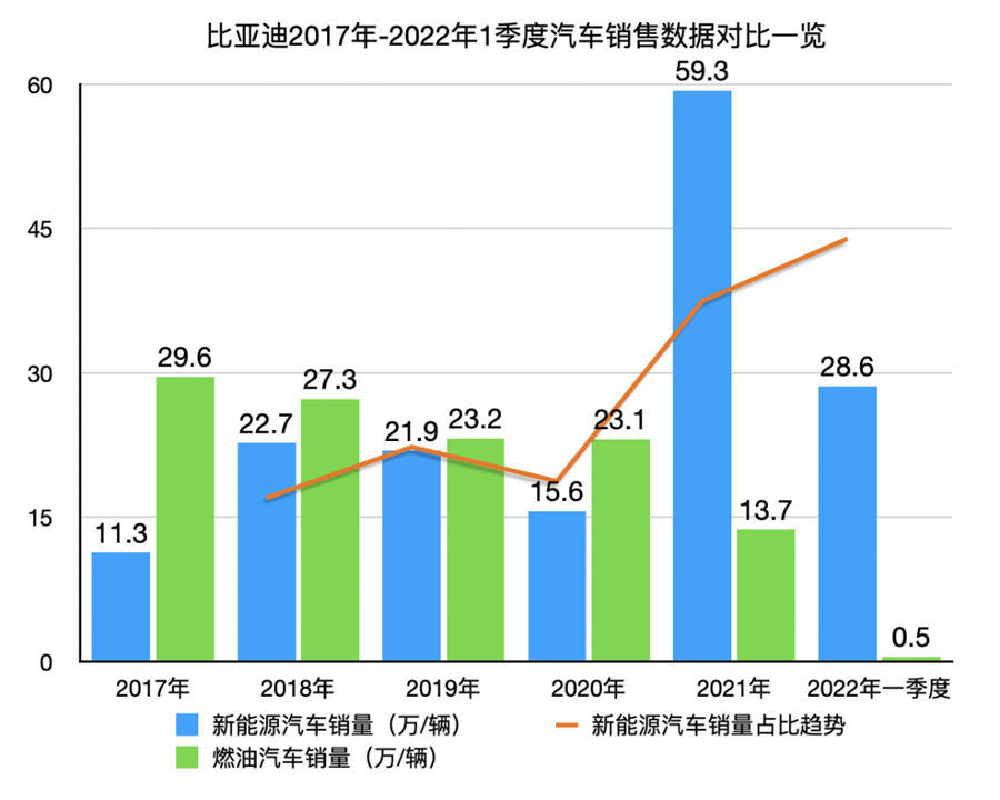 進入2022年,燃油車在比亞迪整體汽車業務中的占比繼續降低。2022年4月3日,比亞迪公布的產銷數據顯示,一季度燃油車銷量為0.5萬輛,同比下滑89.78%,在整體銷量中占比僅1.73%;新能源汽車銷量為28.63萬輛,同比大增423%。