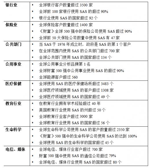 SAS業務領域遍及多個行業,包括汽車、銀行、通信、教育、金融服務、政府、健康保險、醫療保健提供商、酒店和娛樂、保險、生命科學、制造、媒體、石油和天然氣、零售和公用事業、互聯網、制藥等各個行業。SAS 在美洲、歐洲、中東、非洲 (EMEA) 和亞太地區開展業務。