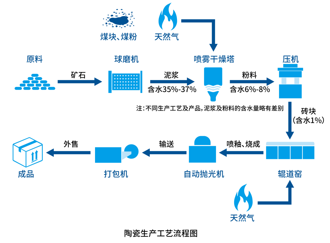 上圖為陶瓷典型生產工藝,原料經由球磨機制為泥漿,再由噴霧干燥塔烘干為粉料,粉料經由壓機成型,由輥道窯噴釉燒成,最終拋光后形成成品。其中烘干是陶瓷生產工藝中非常重要的工序之一,不但關系著陶瓷的產品質量,而且影響陶瓷企業的能耗及排放,故干燥過程的環保、節能是關系到企業生產與發展的重大事項。