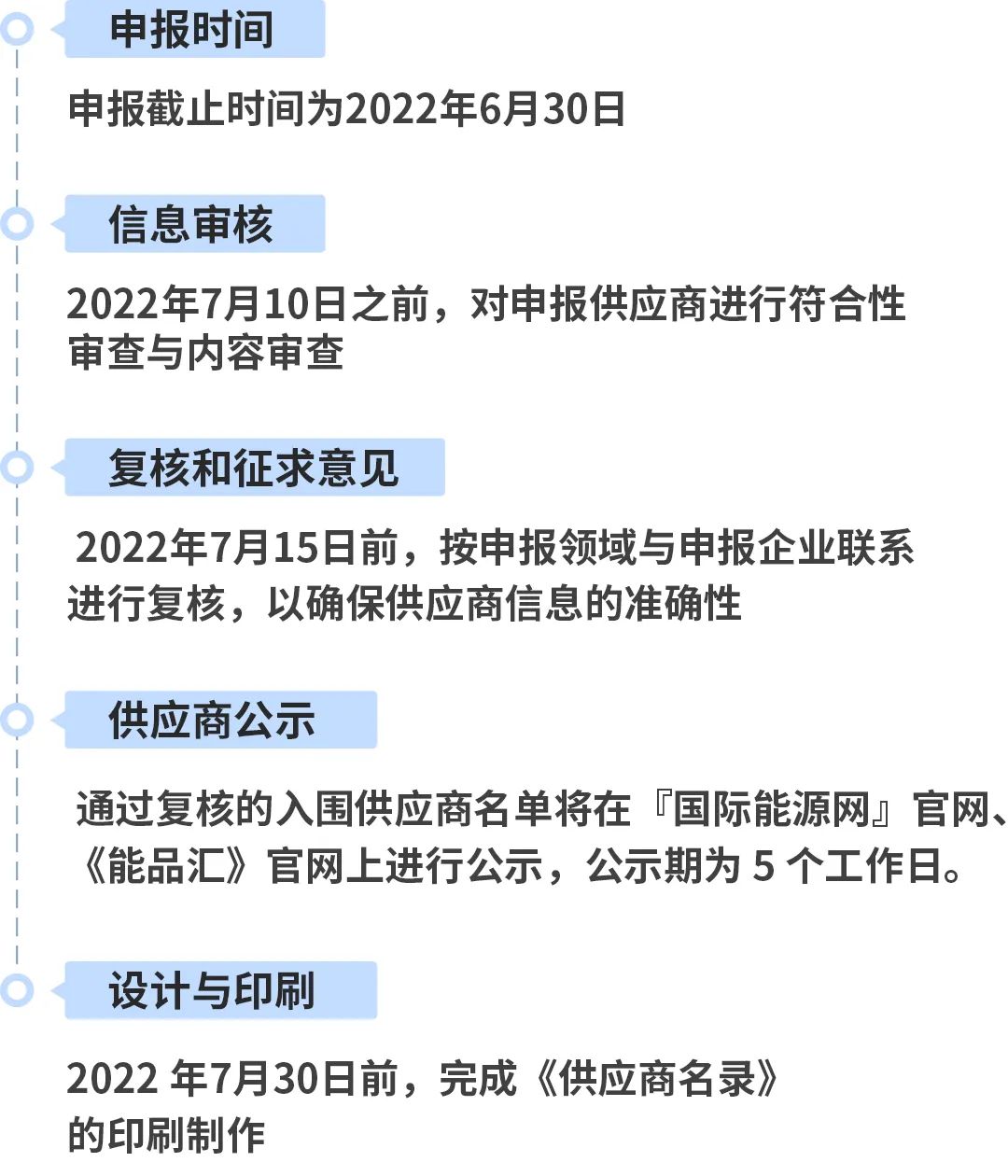 本次征集活動已于5月5日正式啟動,《供應商名錄》將實施供應商篩選計劃,對各報名單位報送的資料進行遴選、評審,堅持公正、公平、公開評審原則,完成供應商收錄。屆時供應商將在《能品匯》官網進行全年展播,并且收錄于《全國風電行業供應商名錄(2022版)》?!豆堂洝啡刖幍钠髽I,將優先作為電商平臺詢價、采購的對象。