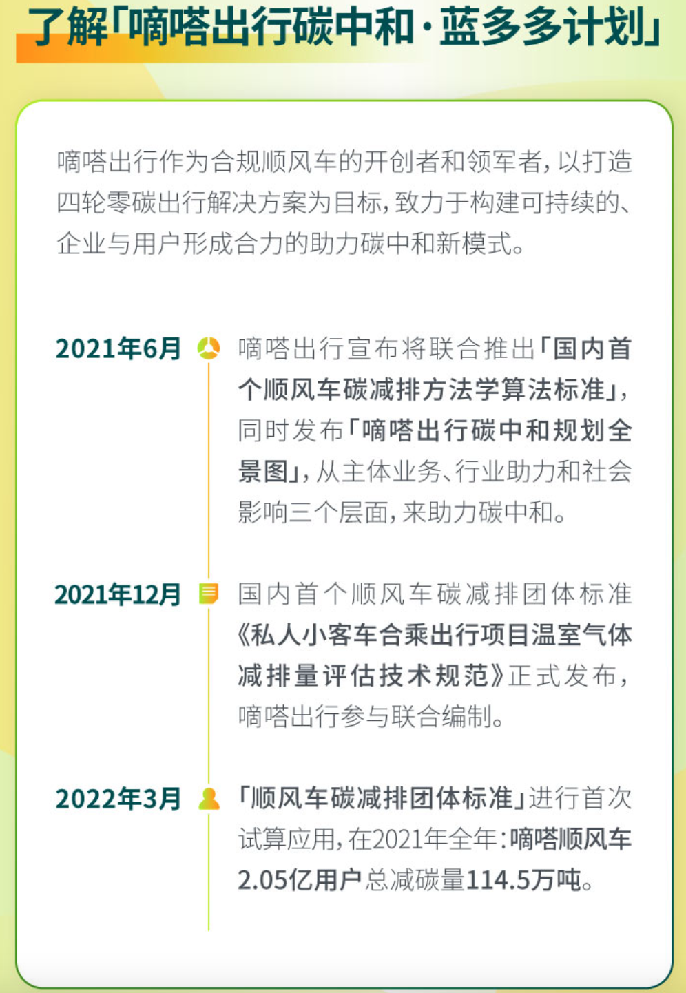 2021年12月,國內首個順風車碳減排團體標準《私人小客車合乘出行項目溫室氣體減排量評估技術規范》正式發布,嘀嗒出行參與聯合編制。