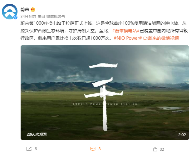 北極星儲能網獲悉,7月6日,蔚來官微消息,蔚來第1000座換電站于拉薩正式上線,這是全球首座100%使用清潔能源的換電站,至此,蔚來換電站已覆蓋中國內地所有省級行政區(qū),蔚來用戶累計換電次數已超1000萬次。