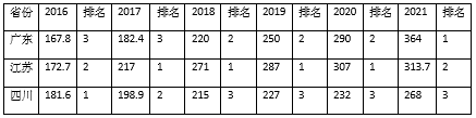 2016-2021年我國天然氣消費量前三名的變化情況(億立方米)