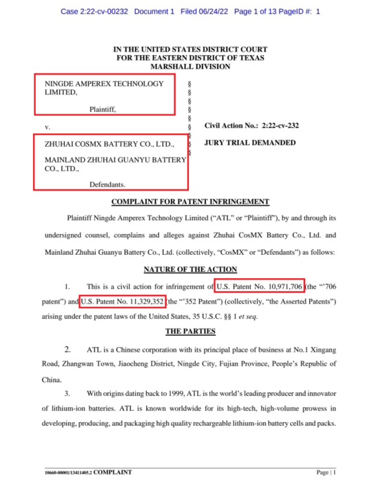 早在6月24日,寧德新能源科技有限公司(ATL子公司)在美國德州東區地方法院起訴了珠海冠宇。