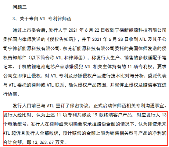 珠海冠宇經比對,認為上述11項專利共涉及19款終端客戶產品,對應公司13個電池型號。珠海冠宇在律師函未明確要求承擔賠償金額的情況下,認為即使未來ATL起訴且發行人全部敗訴,預計賠償的金額上限為銷售相關型號產品的凈利潤合計金額,即13363.67萬元。