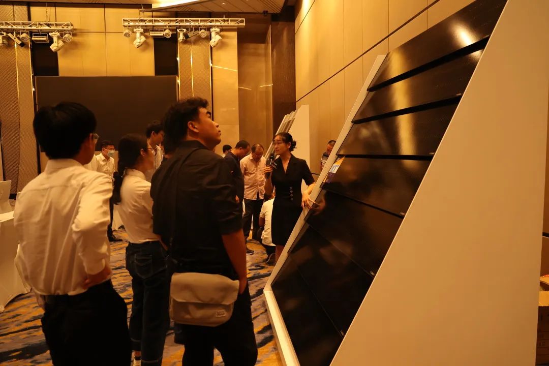中場(chǎng)間歇,東方日升BIPV銷售經(jīng)理童雪峰在超能頂、超能瓦展臺(tái)樣板前對(duì)產(chǎn)品方案與現(xiàn)場(chǎng)嘉賓進(jìn)一步講解交流,答疑解惑,讓嘉賓對(duì)產(chǎn)品看得見(jiàn)、摸得著、懂得多。