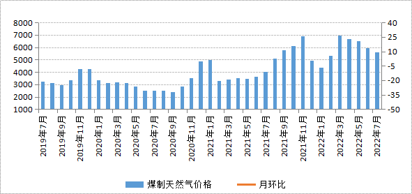 7月份,天然氣市場需求仍處于傳統消費淡季,市場交易氛圍清淡;同時,部分天然氣生產企業檢修結束,天然氣市場供應有所增加,我區煤制天然氣價格延續前期小幅下降走勢。不過,受高溫天氣影響近期發電需求旺盛,所以7月下旬我區煤制天然氣價格有回升跡象。7月份我區煤制天然氣平均交易價格為5593.97元/噸,與6月份相比(下稱環比),價格下降5.63%;與2021年7月份相比(下稱同比),價格上漲39.20%,同比漲幅收窄24.55個百分點。