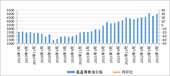 一方面,7月份高溫煤焦油市場存剛需支撐,但是下游深加工企業出現虧損,企業生產積極性降低,高溫煤焦油市場需求整體有所走弱;另一方面,焦企限產力度持續加大,高溫煤焦油供應量縮減。在供應縮減、需求偏弱的環境下,我區煤制高溫煤焦油價格小幅上漲。7月份,我區煤制高溫煤焦油平均交易價格為4978.87元/噸,環比上漲6.10%,同比上漲34.52%。