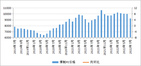 7月份,雖然PE生產企業檢修裝置較多,PE市場供應有所減少,但是由于7月份依然是PE行業傳統消費淡季,PE市場需求整體偏弱,市場多以低價成交為主,所以我區煤制PE價格小幅下降。7月份,我區煤制PE平均交易價格為9240.08元/噸,環比下降7.37%,同比上漲3.72%。
