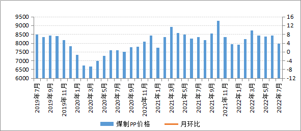7月份,雖然煤制PP裝置檢修較多,PP市場供應壓力有所減小,但是PP下游需求持續偏弱運行,下游企業以逢低按需補庫為主,終端新訂單跟進緩慢,PP市場交易氛圍整體較為清淡,推動我區煤制PP價格小幅下降。7月份,我區煤制PP平均交易價格為7964.50元/噸,環比下降5.33%,同比下降4.47%。