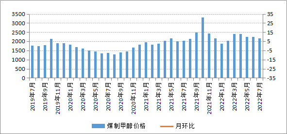 7月份,甲醇市場供應充裕,庫存處于較高位置,但是下游處于消費淡季,貿易商接貨積極性不高,廠家出貨壓力較大;另外,隨著上游煤炭價格下降,甲醇成本支撐也在逐漸減弱,在以上因素共同作用下,我區煤制甲醇價格小幅下降。7月份,我區煤制甲醇平均交易價格為2149.15元/噸,環比下降3.60%,同比上漲5.50%。