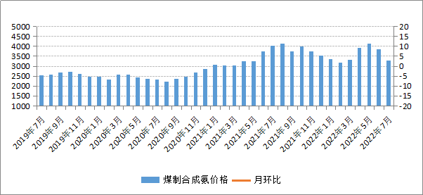7月份,合成氨下游需求繼續走弱,企業多以剛需采購為主,合成氨市場供應壓力漸增,市場交易氛圍較為冷清,我區煤制合成氨價格繼續小幅下降。7月份,我區煤制合成氨平均交易價格為3269.36元/噸,環比下降15.05%,同比下降18.32%。