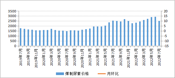 7月份,各地尿素農業需求陸續收尾,尿素農業采購量逐漸減少,而下游膠板行業因成品積壓以及近期降雨影響開工率繼續走低,尿素工業需求較往年同期減少。同時,7月份印度雖有尿素招標計劃,但在收緊的出口政策下對尿素市場行情暫無明顯利好支撐??傊?,雖然7月份尿素裝置檢修不斷,日產有所下降,但是在需求走弱的環境下,尿素供應壓力較大,推動我區煤制尿素價格高位回落。7月份,我區煤制尿素平均交易價格為2509.08元/噸,環比下降14.25%,同比略降0.26%。