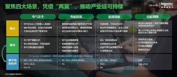 “四大場景”即“電氣安全、電能質量、能效雙碳、綜能微網”。施耐德電氣數字能源服務部總經理楊平表示,施耐德電氣在服務領域有四大目標市場,即建筑、工業、基礎設施和數據中心,而電氣安全、電能質量、能效雙碳、綜能微網四大場景是支撐這四大目標客群可持續發展和數字化低碳轉型的關鍵支柱或者關鍵場景。