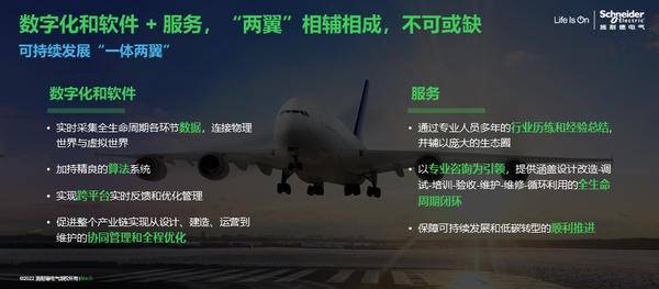 基于這四大場景中的不同痛點,施耐德電氣打造的解決方案核心是可持續“一體兩翼”:以可持續為“一體”,以服務和數字化為“兩翼”。施耐德電氣認為,貫穿全生命周期的服務是數字化落地的核心與重要載體,而以軟件為核心的數字化技術是當前最佳的減碳工具。施耐德電氣以專業咨詢為引領,提供涵蓋改造、調試、培訓、驗收、維護、維修、循環利用的全生命周期服務閉環;而與服務相輔相成,施耐德電氣以軟件為核心的數字化技術正在融入應用場景,實現對產品和資產全生命周期的數據“可視、可管、可控、可用”,進而促進整個產業鏈實現全生命周期的協同管理和全程優化,推動客戶數字化價值落地的同時實現全程減碳。