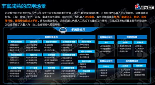 遠光軟件基于YG-RPA云平臺已經成功打造出數百款RPA機器人,應用場景覆蓋到財務、工程、營銷、生產、運監、審計等業務領域,涉及行業囊括電力、能源化工、航空、醫療等,服務單位遍布全國各省市超過上千家,為企業節省了大量人力,推動企業管理變革和業務創新。
