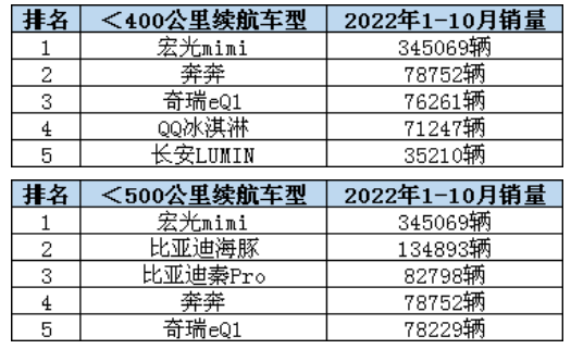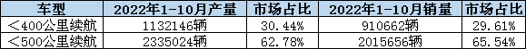 從國內電動汽車產銷量看,動力電池應用分會數據顯示,2022年1-10月國內400公里以下續航車型產量占電動車市場的30.44%,500公里以下續航車型占62.78%;銷量占比也基本保持同頻,400公里和500公里以下續航車型銷量分別占29.61%和65.54%。