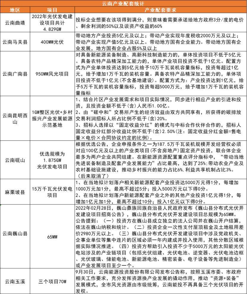光伏們根據(jù)公開信息統(tǒng)計(jì),2022年云南省已先后有巍山、曲靖、馬關(guān)、玉溪等8個(gè)地市提出了不同形式的產(chǎn)業(yè)配套要求,花樣涵蓋承諾地方政府相應(yīng)電價(jià)、承諾資產(chǎn)收益、帶動(dòng)地方產(chǎn)業(yè)投資等等。這些千萬甚至上億金額的產(chǎn)業(yè)配套不僅疊加了電站的成本,也進(jìn)一步惡化了云南新能源投資的營商環(huán)境。