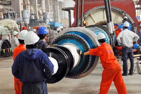 11點10分,經過3小時緊張有序的工作,發電機轉子一次穿裝成功,整個過程安全順利,轉子、定子鐵芯都完好無損,保證了較高的工藝質量和安裝精度。