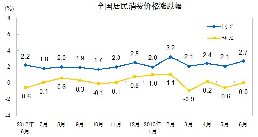 2013年6月份,全國居民消費價格總水平同比上漲2.7%。其中,城市上漲2.6%,農村上漲2.8%;食品價格上漲4.9%,非食品價格上漲1.6%;消費品價格上漲2.6%,服務價格上漲2.7%。上半年,全國居民消費價格總水平比去年同期上漲2.4%。