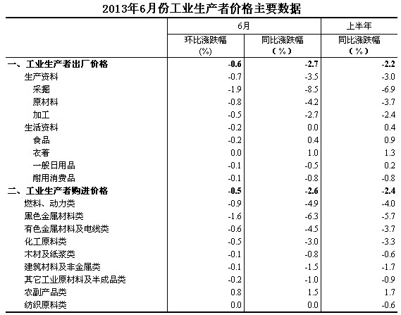 2013年6月份,全國工業(yè)生產(chǎn)者出廠價格同比下降2.7%,環(huán)比下降0.6%。工業(yè)生產(chǎn)者購進價格同比下降2.6%,環(huán)比下降0.5%。上半年,工業(yè)生產(chǎn)者出廠價格同比下降2.2%,工業(yè)生產(chǎn)者購進價格同比下降2.4%。