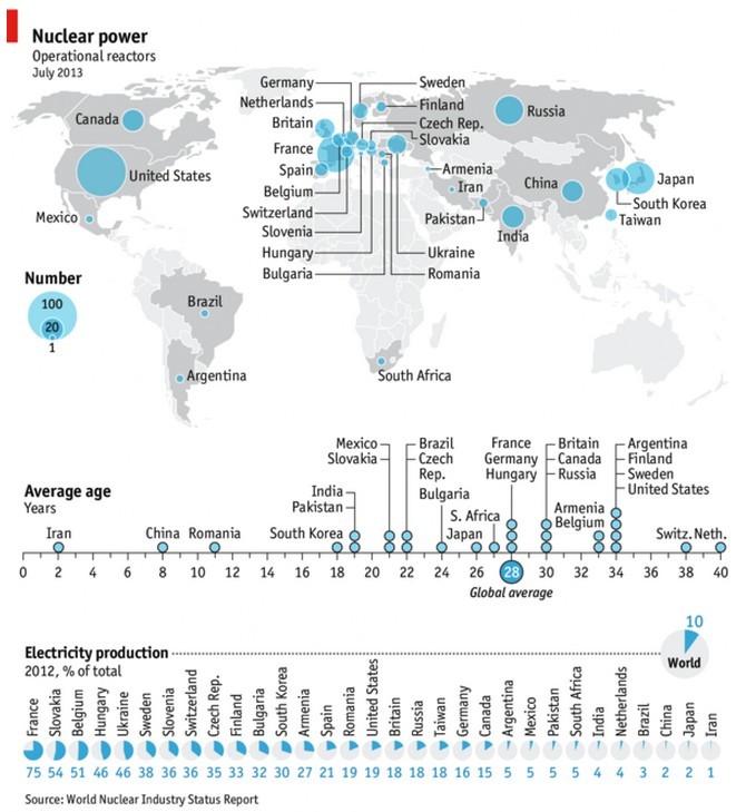全球共有30(原文為31,中國(guó)能源網(wǎng)數(shù)據(jù)為30)個(gè)國(guó)家使用核能為其生產(chǎn)生活提供動(dòng)力。歐洲的核電已占據(jù)整個(gè)歐洲發(fā)電量的30%。2012年,全球只有一座新的核反應(yīng)堆被啟用,但今年僅半年時(shí)間全球已有14座投入使用。