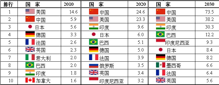2010年渣打銀行對前10位最大的經(jīng)濟(jì)體從2010年至2030年的估計(jì),中國GDP約在2020年將超過美國。