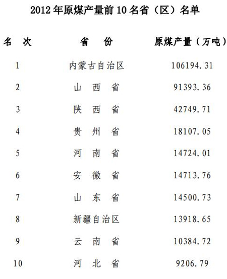 為促進煤炭工業(yè)健康可持續(xù)發(fā)展,加快煤炭產(chǎn)業(yè)結構調(diào)整,全面反映全國重點產(chǎn)煤省(區(qū))、地(市)、縣(市)煤炭工業(yè)情況,9月23日,中國煤炭工業(yè)協(xié)會向全社會發(fā)布2012年前10名產(chǎn)煤省(區(qū))、前100名產(chǎn)煤地(市)、前100名產(chǎn)煤縣(市)原煤產(chǎn)量。