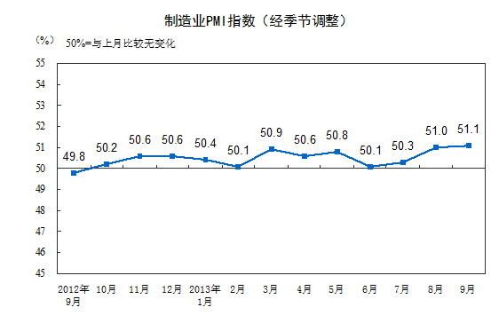 據統計局網站消息,2013年9月,中國制造業采購經理指數(PMI)為51.1%,比上月上升0.1個百分點,連續3個月回升。