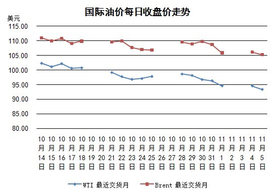11月5日國際油價在4日短暫止跌后繼續下探,紐約WTI價格更是創下了6月份以來的新低。11月6日美國能源信息署將公布石油庫存周報。路透社以10名分析師為對象的調查預測,截至11月1日美國原油庫存比前一周增加160萬桶。如果該預測正確,那么原油庫存將連續7周增加,并預示需求放緩的長期化。美國俄克拉荷馬州庫欣中心截至10月25日庫存也大幅增加200萬桶,是2012年12月以來的最大增量。