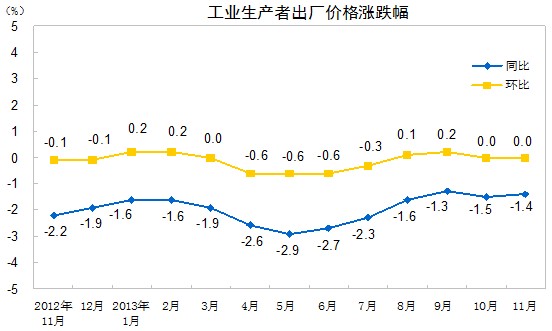 2013年11月份,全國工業(yè)生產(chǎn)者出廠價(jià)格同比下降1.4%,環(huán)比持平(漲跌幅度為0,下同)。工業(yè)生產(chǎn)者購進(jìn)價(jià)格同比下降1.5%,環(huán)比持平。1-11月平均,工業(yè)生產(chǎn)者出廠價(jià)格同比下降2.0%,工業(yè)生產(chǎn)者購進(jìn)價(jià)格同比下降2.1%。
