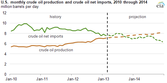 據(jù)EIA消息,美國(guó)原油月度產(chǎn)量有望在今年晚些時(shí)候超過(guò)原油進(jìn)口量,這將是1995年2月以來(lái)的首次。依據(jù)EIA在2013年3月發(fā)布的短期能源展望,原油月度產(chǎn)量與進(jìn)口量之間的差距有望在明年年底達(dá)到200萬(wàn)桶/天。