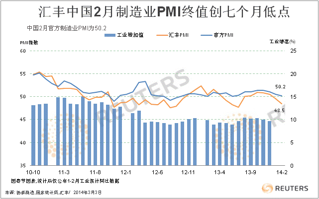 匯豐(HSBC)/Markit周一聯(lián)合公布,中國2月制造業(yè)采購經(jīng)理人指數(shù)(PMI)終值為48.5,較初值48.3略微上修,但仍低于1月終值49.5,為去年7月以來最低水平。