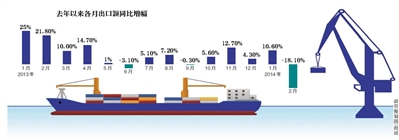 沈丹陽表示,由于春節因素影響,我國歷年1、2月外貿增速往往波動較大。而去年年初個別地區出現貿易異常增長,導致同比基數較高,也是出口增速急劇回落的另一原因。此外,一些新興經濟體受美聯儲啟動退出量化寬松政策進程等因素影響,出現進口需求的短期萎縮,可能也是造成我國出口增速下降的原因之一。