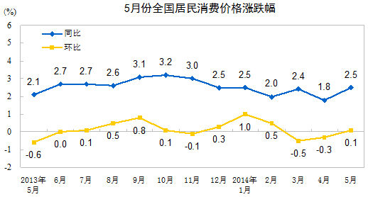 2014年5月份,全國居民消費價格總水平同比上漲2.5%。其中,城市上漲2.5%,農(nóng)村上漲2.3%;食品價格上漲4.1%,非食品價格上漲1.7%;消費品價格上漲2.4%,服務價格上漲2.7%。1-5月平均,全國居民消費價格總水平比去年同期上漲2.3%。