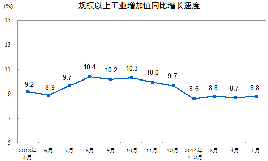 2014年5月份,規模以上工業增加值同比實際增長8.8%(以下增加值增速均為扣除價格因素的實際增長率),比4月份加快0.1個百分點。從環比看,5月份比上月增長0.71%。1-5月份,規模以上工業增加值同比增長8.7%。