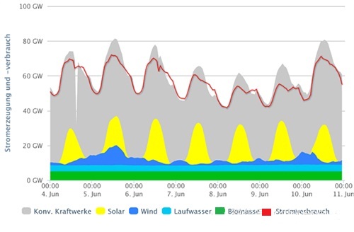 黃線是光伏,藍線是風力,灰色是總體發電出力,而紅線就是德國總體的電力負荷需求。不難看出,6月9日就光伏出力而言并不是最高,才剛剛超過23GW,之前的6月5日和前不久的7月3日絕對數量上都有超過。而之所以引人注目以6月9日作為標桿,是因為相比之下這天的電力負荷非常低,所以才使得光伏發電所占比例凸顯。