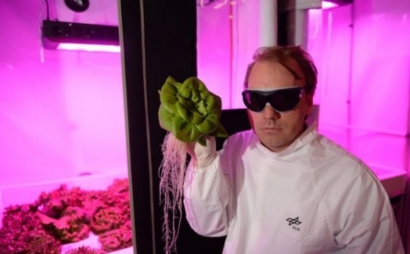 工程師丹尼爾-舒伯特在德國航空中心手拿一棵生菜,火星上的宇航員很快就能采用相同系統(tǒng)種植水果和蔬菜。