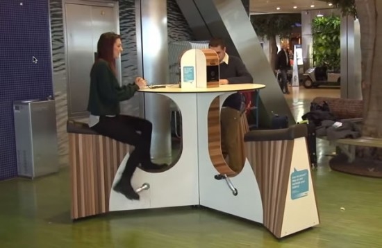 這種“桌椅”名為“WeBike”,用戶坐在上邊踩腳踏板騎單車,桌椅原地不動,卻能同時為擺在桌面上的電腦、手機和無線路由器等設備供電,工作運動兩不誤。