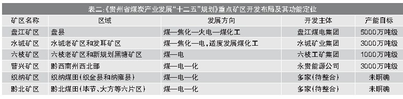 貴州含煤面積占總面積的40%以上,主要分布在六盤水煤田、織納煤田和黔西北三大區(qū)域。在各路企業(yè)搶灘資源的同時,貴州省對煤炭開發(fā)的格局做了明確劃分(見表二)。