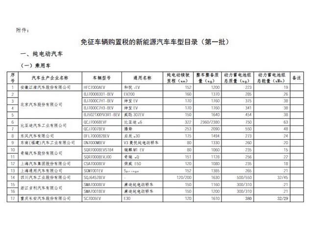 工信部:免征車輛購置稅的新能源汽車車型目錄(第一批)
