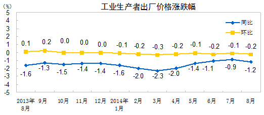 2014年8月份,全國工業生產者出廠價格同比下降1.2%,環比下降0.2%。工業生產者購進價格同比下降1.4%,環比下降0.1%。1-8月平均,工業生產者出廠價格同比下降1.6%,工業生產者購進價格同比下降1.8%。