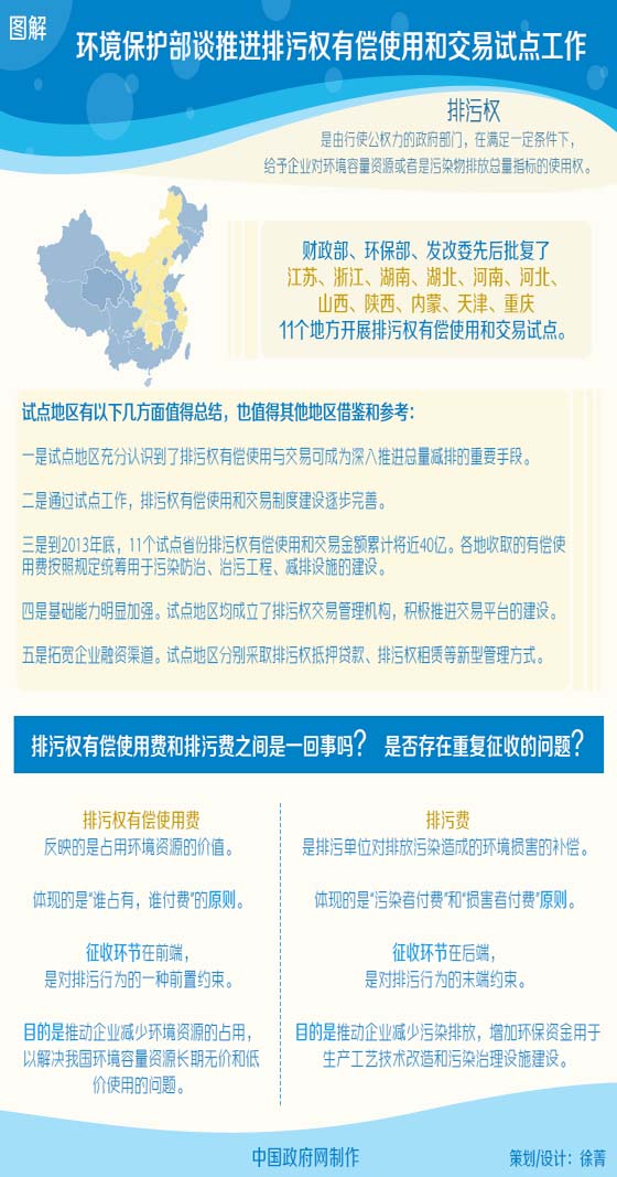 9月16日訊,從中國(guó)政府網(wǎng)獲悉,環(huán)境保護(hù)部談推進(jìn)排污權(quán)有償使用和交易試點(diǎn)工作,圖示如下: