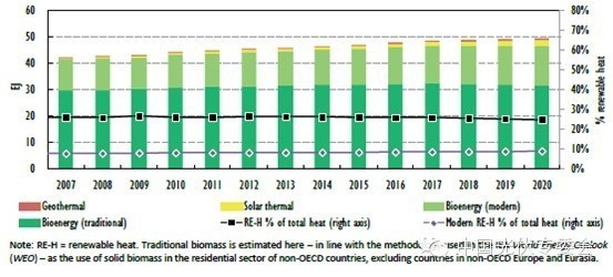 全球可再生能源供熱(包括傳統生物質燃料)到2020年預計將達到49.7EJ[1](每年1%的增長率)。以此同時,由于城鎮化和現代供能手段的發展,傳統生物質能源的使用量在大多數費OECD國家中將大幅減少,新型可再生能源供熱量將由2013年的14.5EJ增長到2020年的17.9EJ.