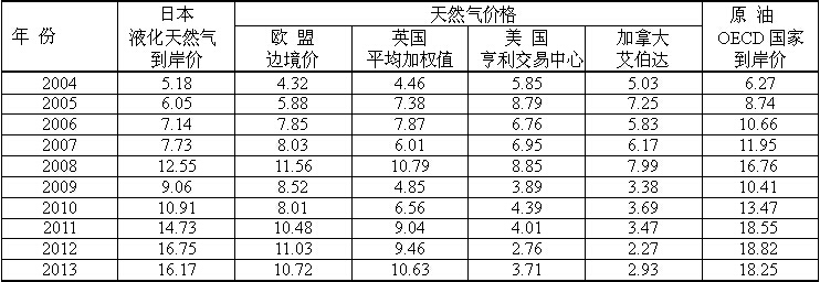 表1 2004-2013年全球市場天然氣市場價格(美元/MBtu)