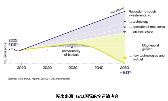 以下圖表顯示的是國際航空運(yùn)輸協(xié)會(IATA)的二氧化碳減排戰(zhàn)略,計劃在2005年到2050年期間減少一半的排放量↓↓↓