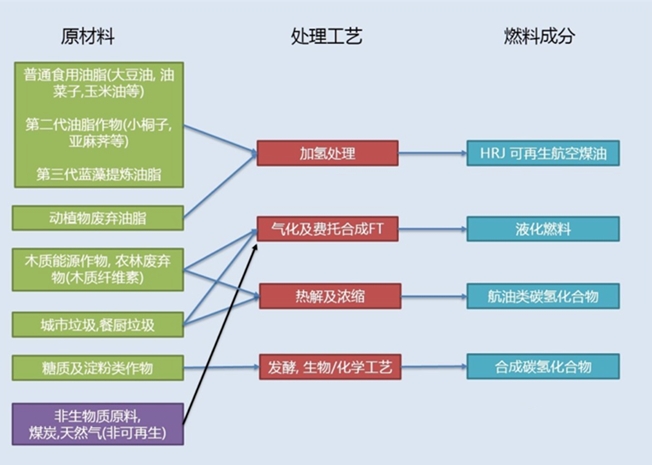 雖然生物航空燃料的確處在技術(shù)領(lǐng)域尖端, 但也并非外界傳說的那么“逆天”。目前,生物航空燃料采用的主要工藝有加氫(Hydrotreated Esters and Fatty Acids,HEFA)和費(fèi)托合成(Fischer –Tropsch,F(xiàn)T)。主要技術(shù)差別在于效率、能耗以及資源整合水平。以下是一些技術(shù)路線的整合和總結(jié):